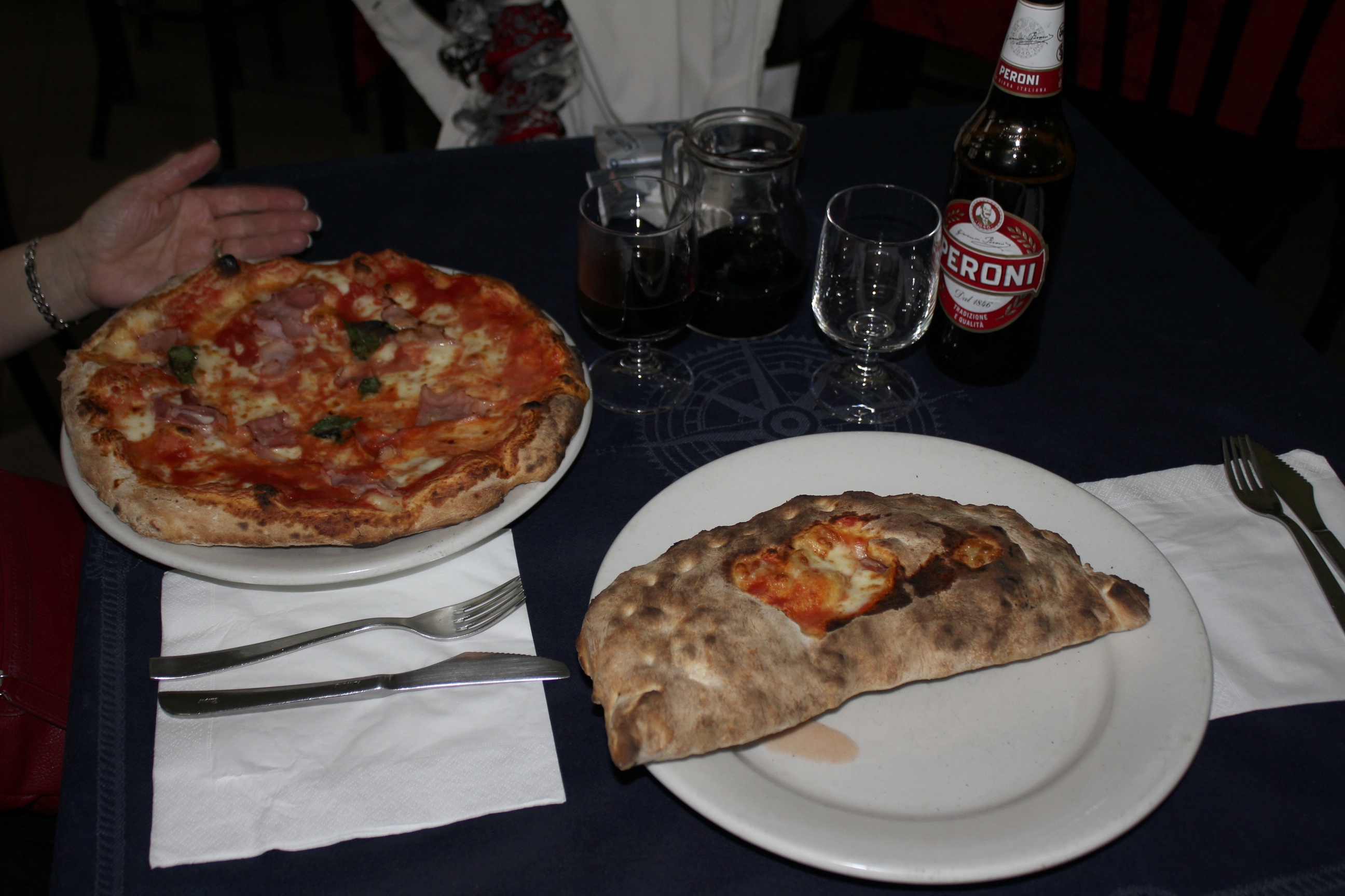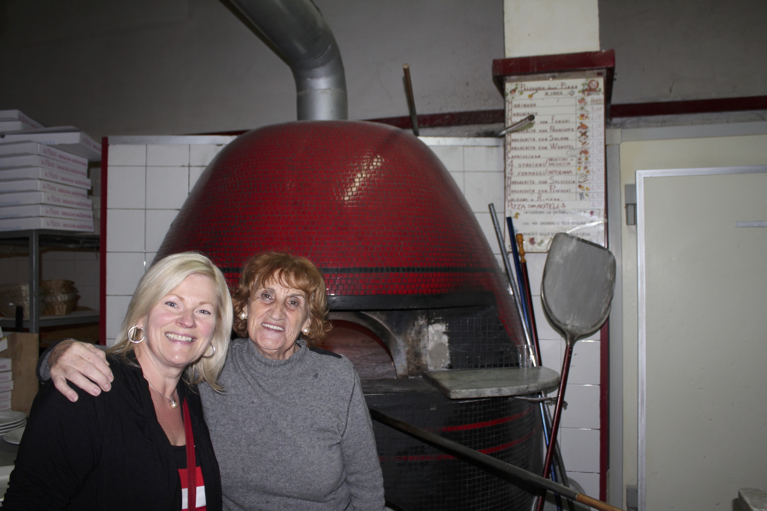 Nous avons pris le lunch dans une pizzeria “familiale” (pizza et calzone cuits dans un four à bois) et avons pris des photos de l’endroit et de la Mama.