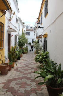 Départ en autobus « local » pour Marbella. Il ne fait pas chaud et nous avons mis nos petits manteaux de pluie pour la première fois. Nous avons marché du terminus d’autobus au jusqu’au centre-ville. Nous avons visité le quartier historique qui est constitué de petites ruelles qui s’entrecoupent, c’est comme un labyrinthe. Il facile de s’y perdre mais nous avons une carte pour nous retrouver. Il y a des magasins partout ce qui a permis aux dames du groupe d’acheter des foulards pour se réchauffer.